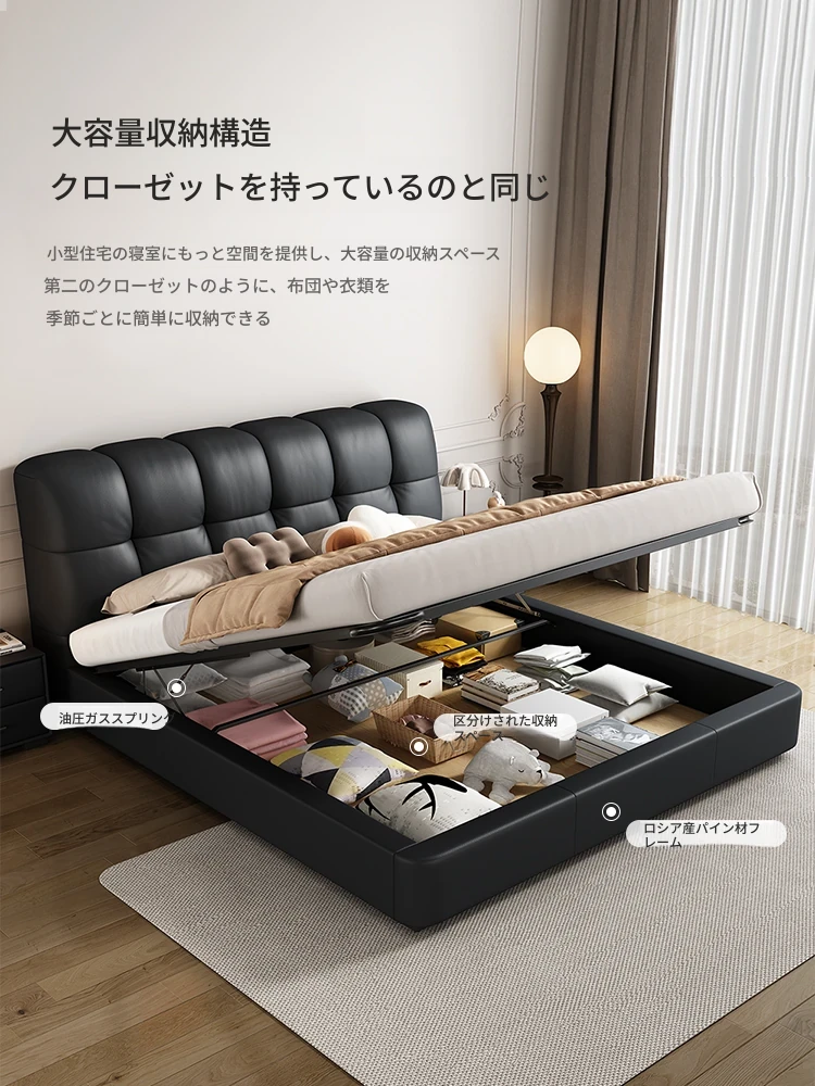 2025年新作!高級感あふれる本革製1.8mダブルベッド - モダンでシンプルなデザイン、収納力抜群のハイボックス&快適なソフトバックレスト付き!主寝室にぴったりな贅沢な寝心地を実現します!