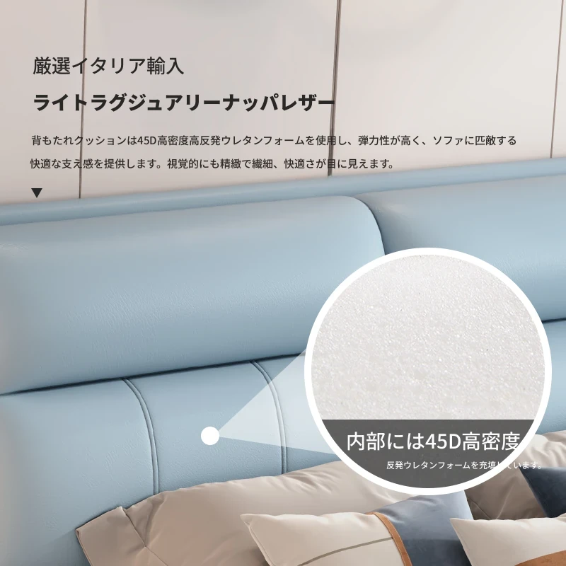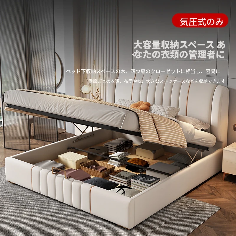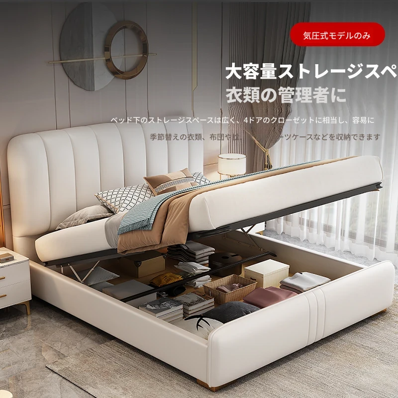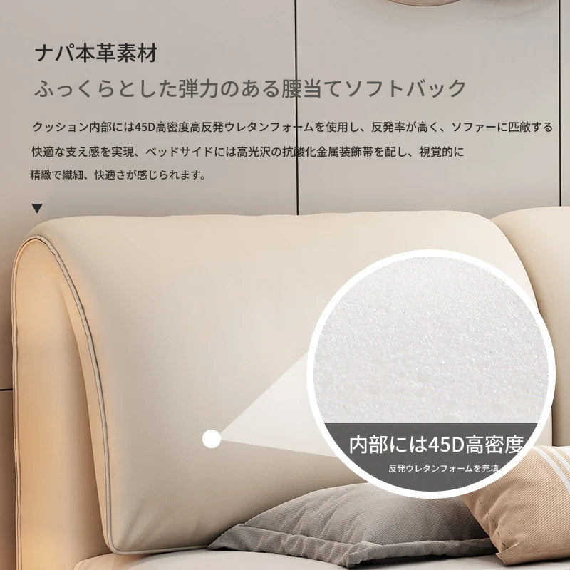 高級感あふれる本革ダブルベッド - モダン&シンプルなデザイン、収納付きの北欧スタイル。ふわふわのソフトバックレストで、理想の新婚ベッドにぴったり!
