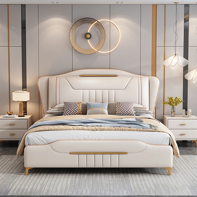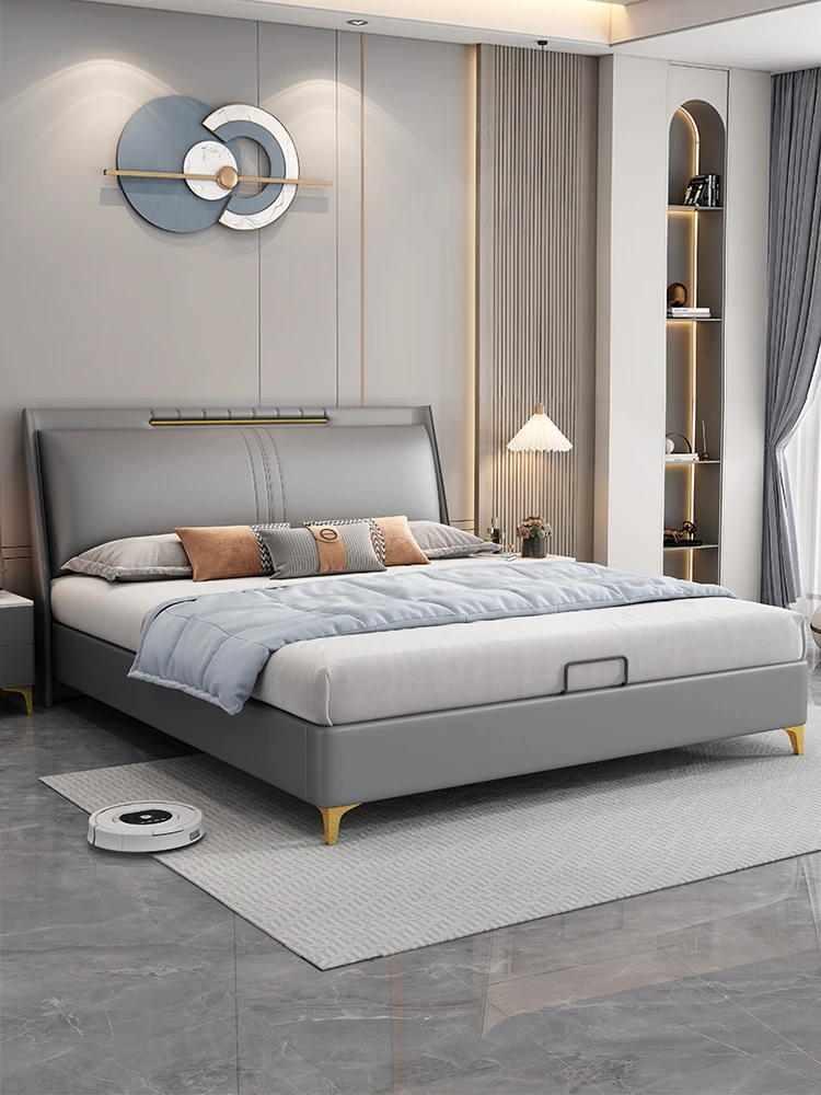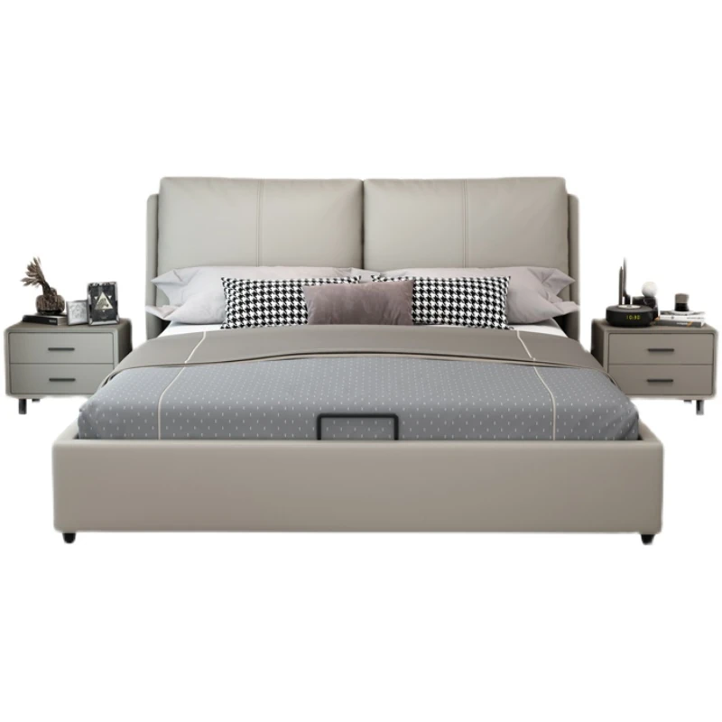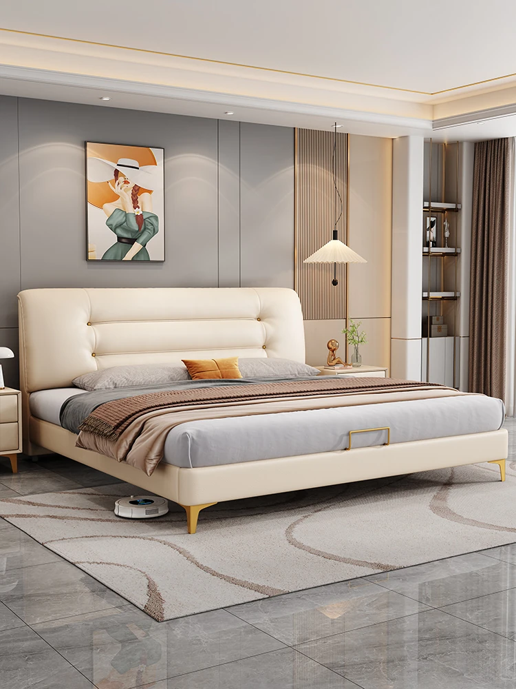 イタリアンミニマリズム真皮レザー主寝室用高級ダブルベッド 2023年新作収納付きモダンデザイン - 快適な睡眠と洗練されたスタイルを実現するエレガントな家具です!