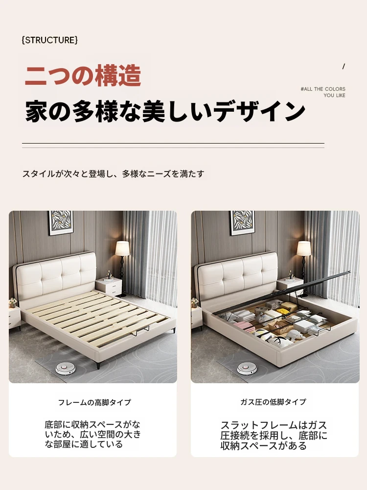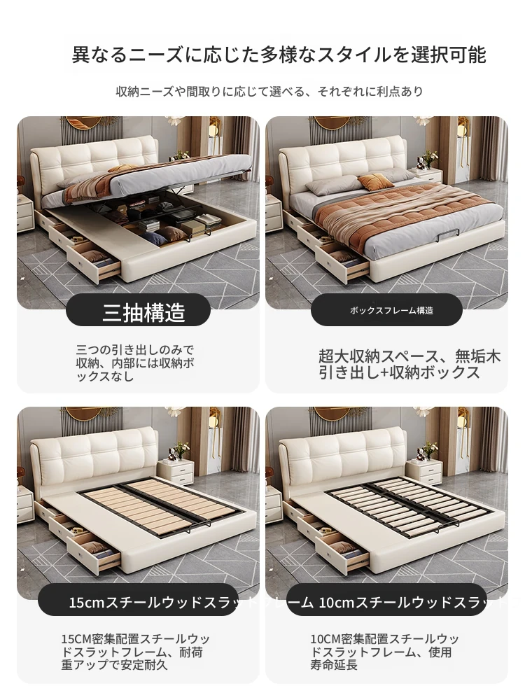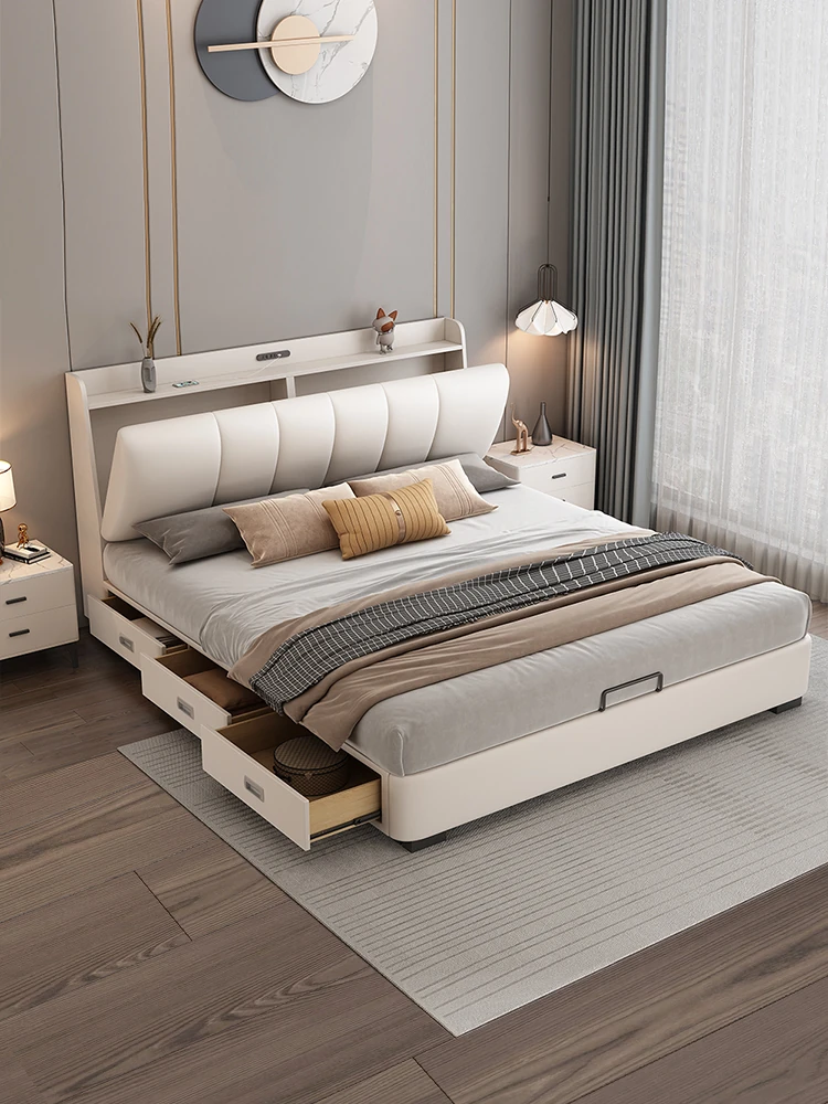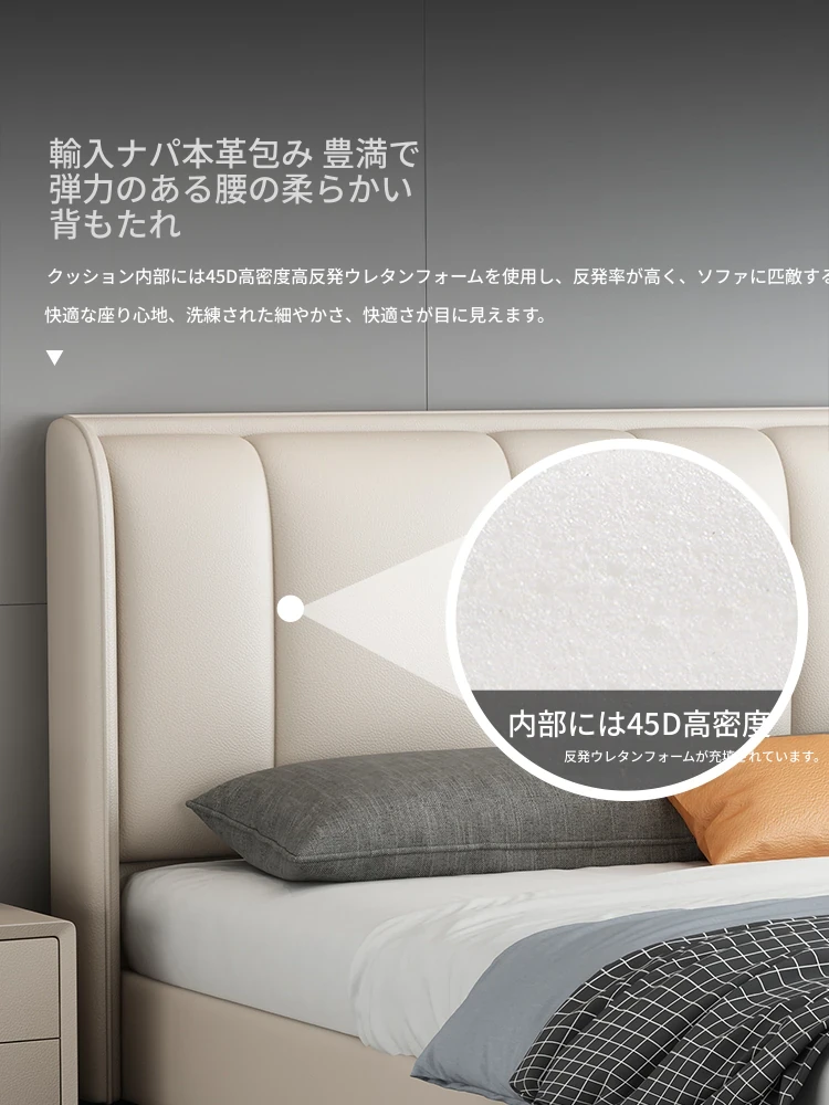 北欧スタイルのナパレザー製モダンシンプル主寝室用本格木製ベッド|多機能ソフトクッション付き収納ライトラグジュアリーダブルベッド|快適な睡眠空間を演出する贅沢な選択!