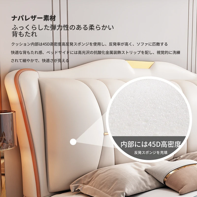 高級感溢れる本革モダンデザインベッド|シンプルで洗練された1.8mダブルベッド|北欧スタイルの収納機能付きソフトバックレスト|理想の主寝室にぴったり!