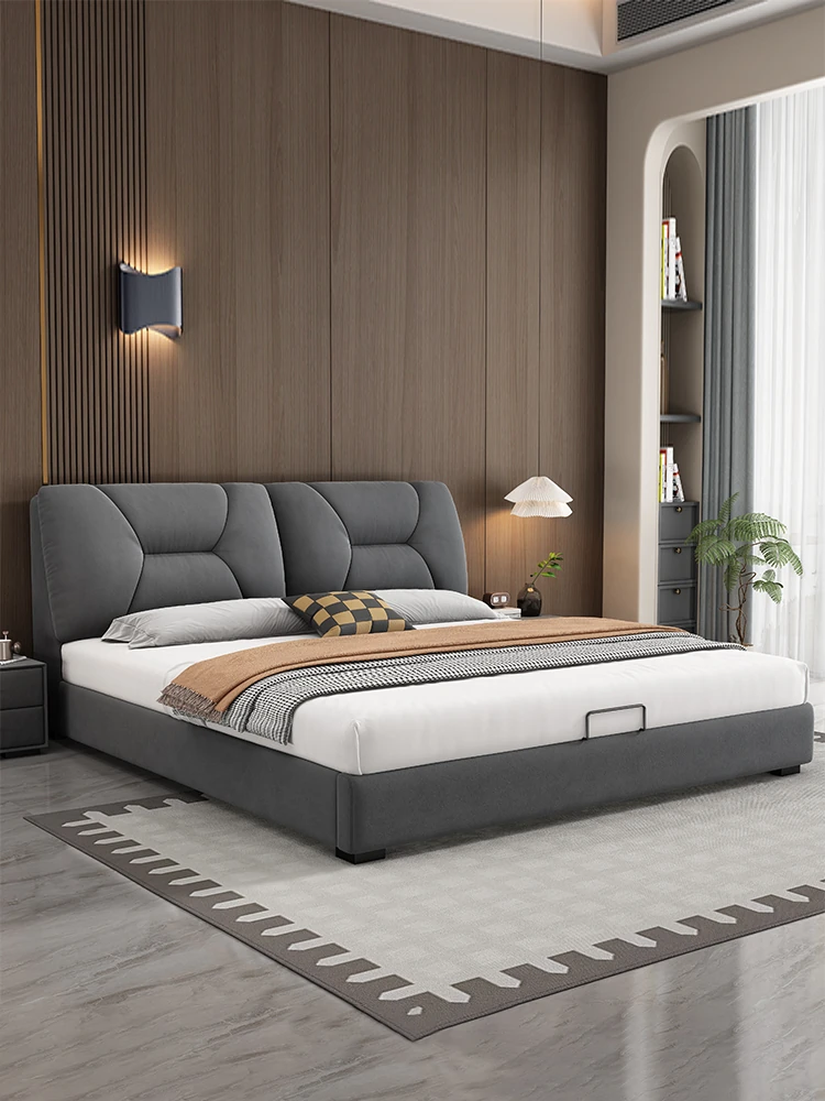 本革製モダンシンプル2023新作1.8メートルダブルベッド、柔らかい背もたれ付き高収納タイプ、天然木使用の主寝室用キングサイズベッド—快適な睡眠空間を実現!