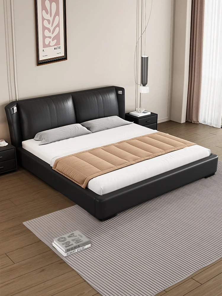 モダンでシンプルなインポート本革ベッド|リュクスなダブルベッド|天然木スラットフレーム|柔らかな背もたれ|高級感あふれる主寝室用|スタイリッシュなデザインで快適さを追求