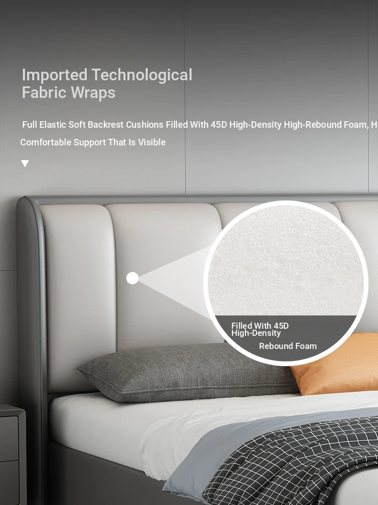 Modern Luxury Genuine Leather Bed – Stylish 1.8m Double Bed with Ergonomic Soft Backrest, Nordic-Inspired Design & Storage Solution for Your Chic Master Bedroom